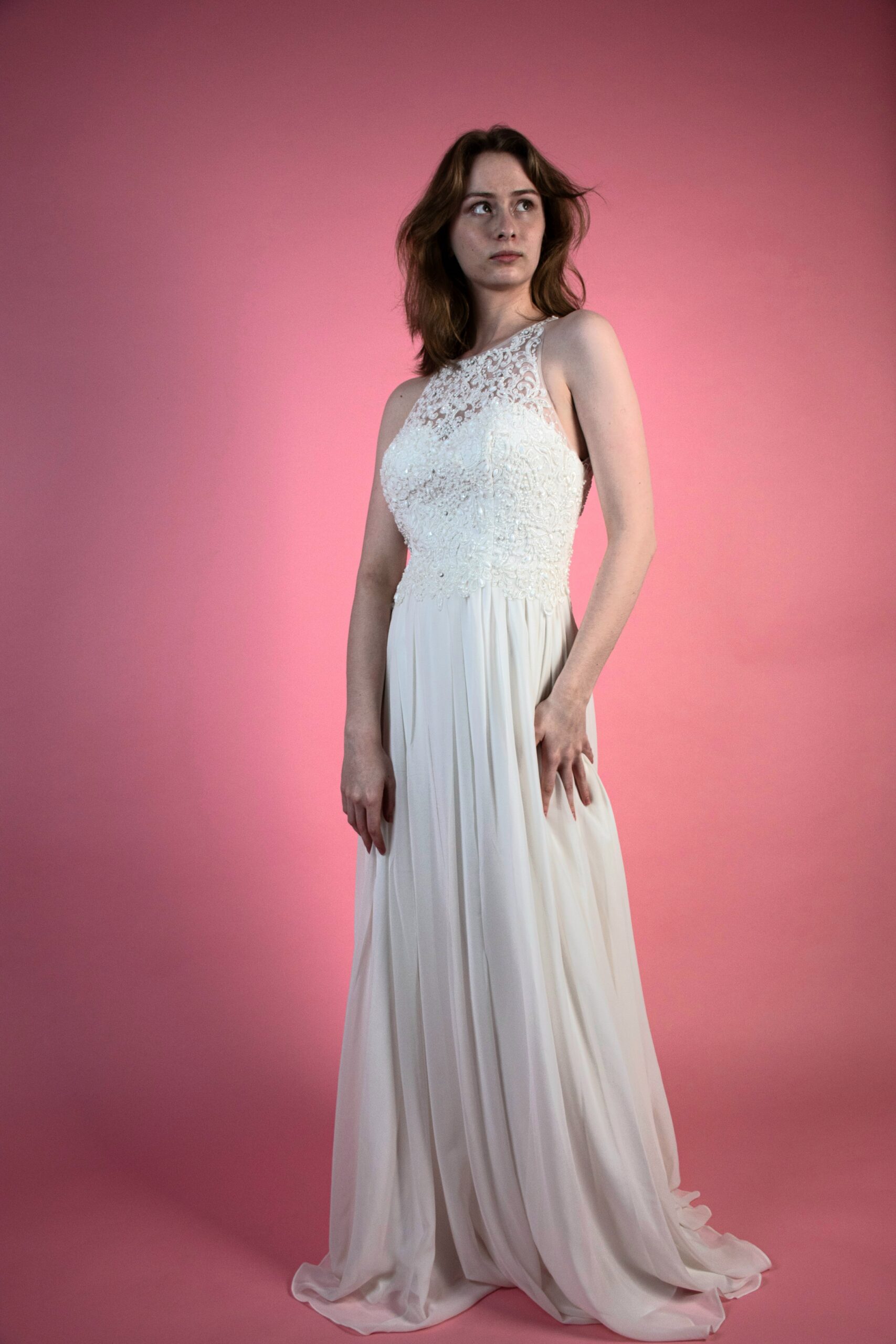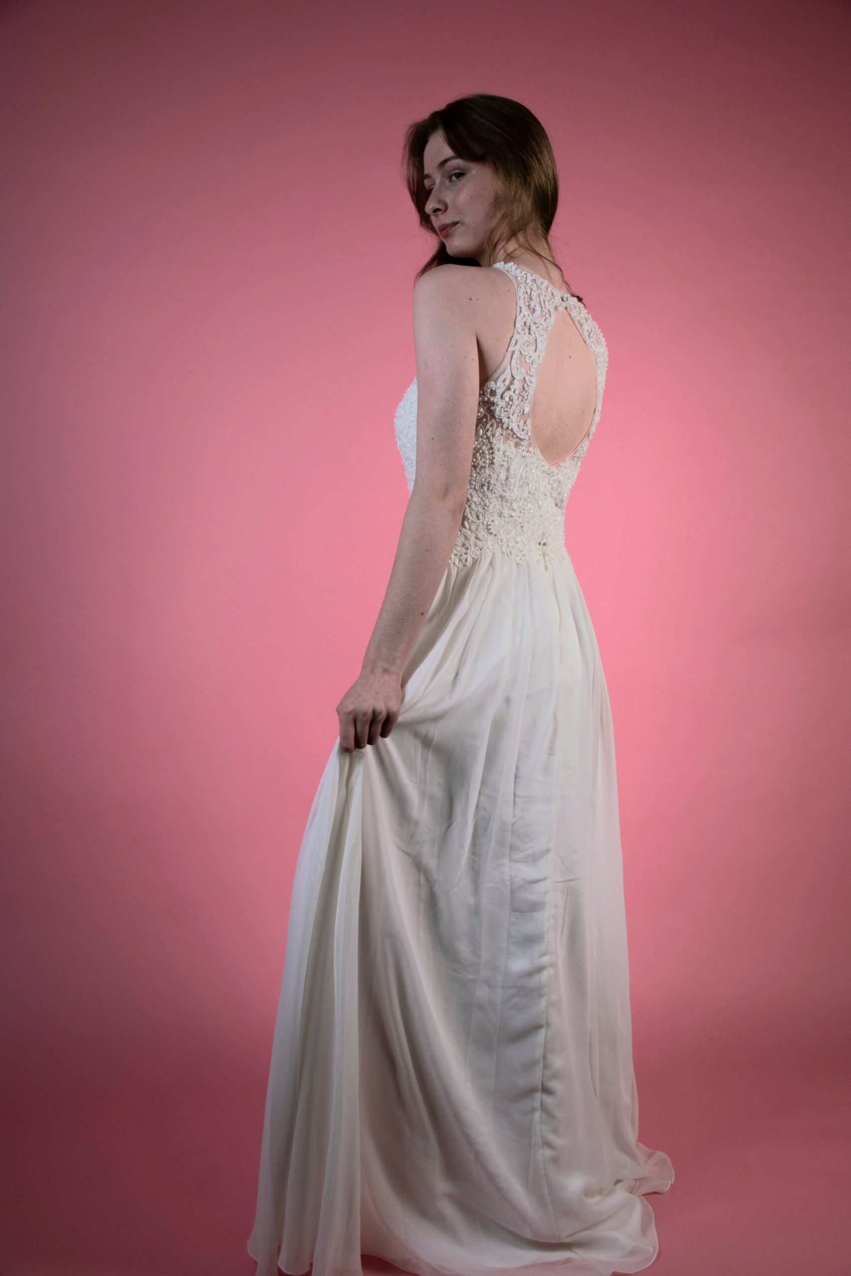 Dlouhé bílé šaty s vyšivaným torzem.