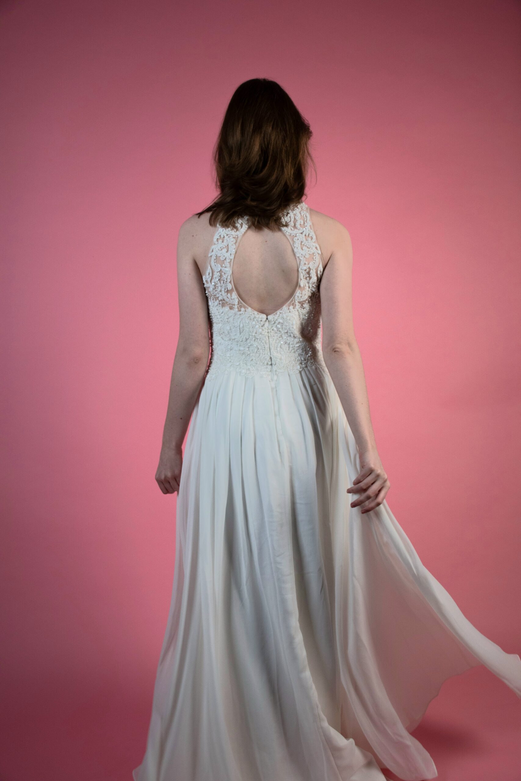 Šaty mají odhalené záda a zapínání na zip.