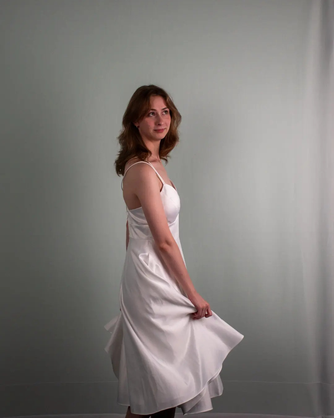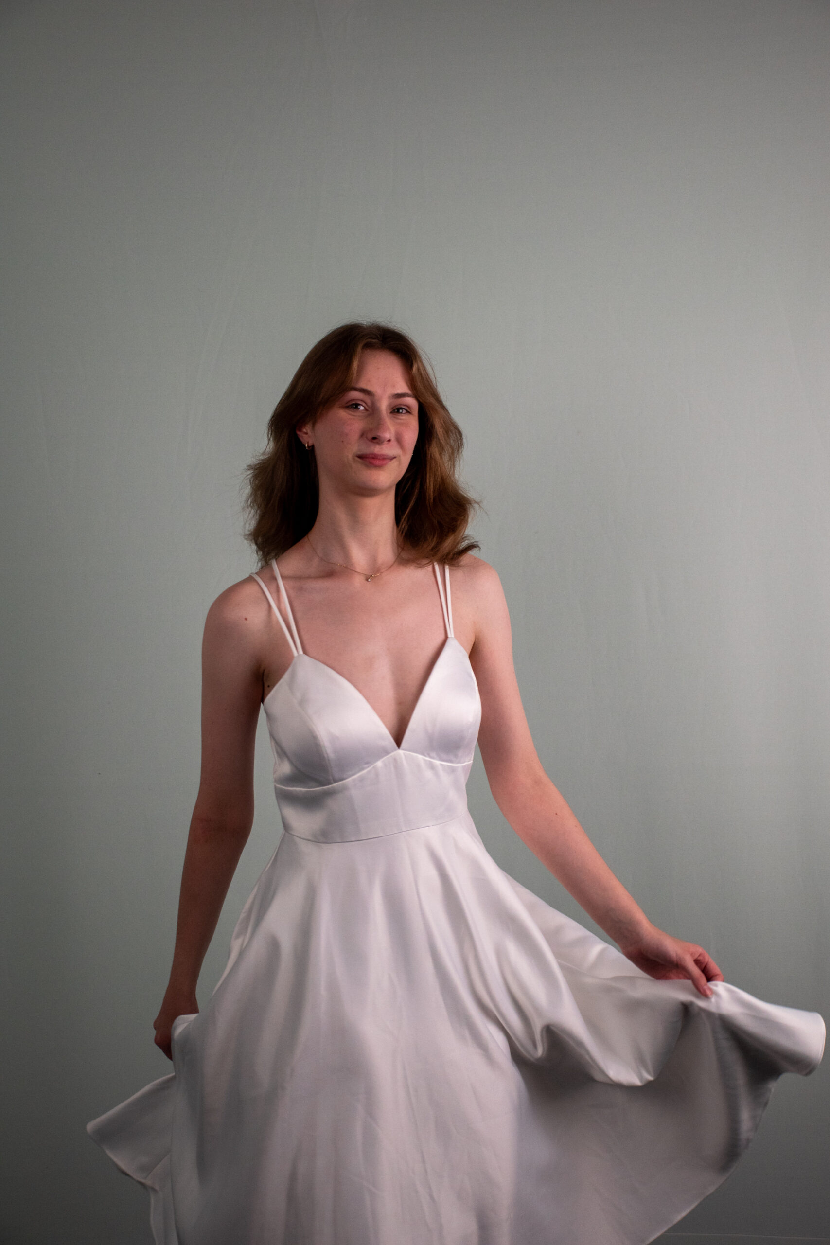 Šaty mají špagetová ramínka, vyztužené torzo a kolovou sukni.