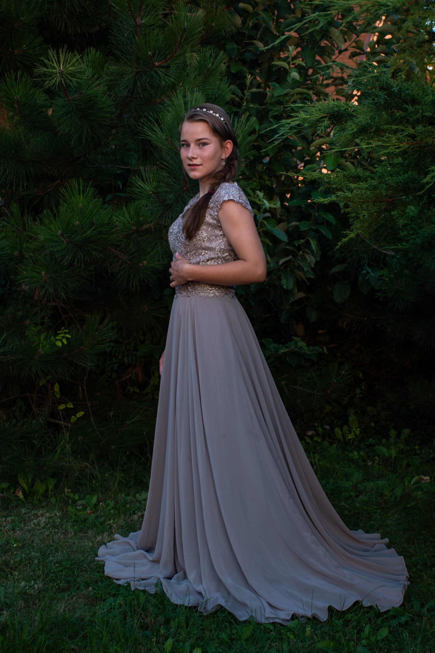 Dlohé šedé šaty s vlečkou.