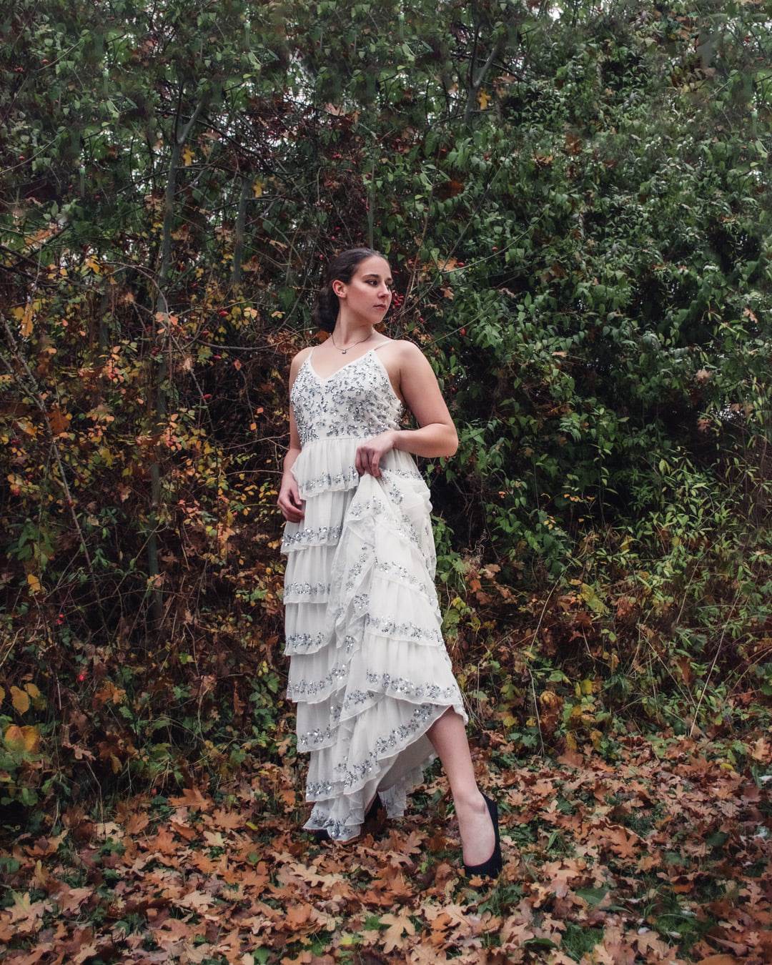 Dlouhé bílé šaty s korálky.