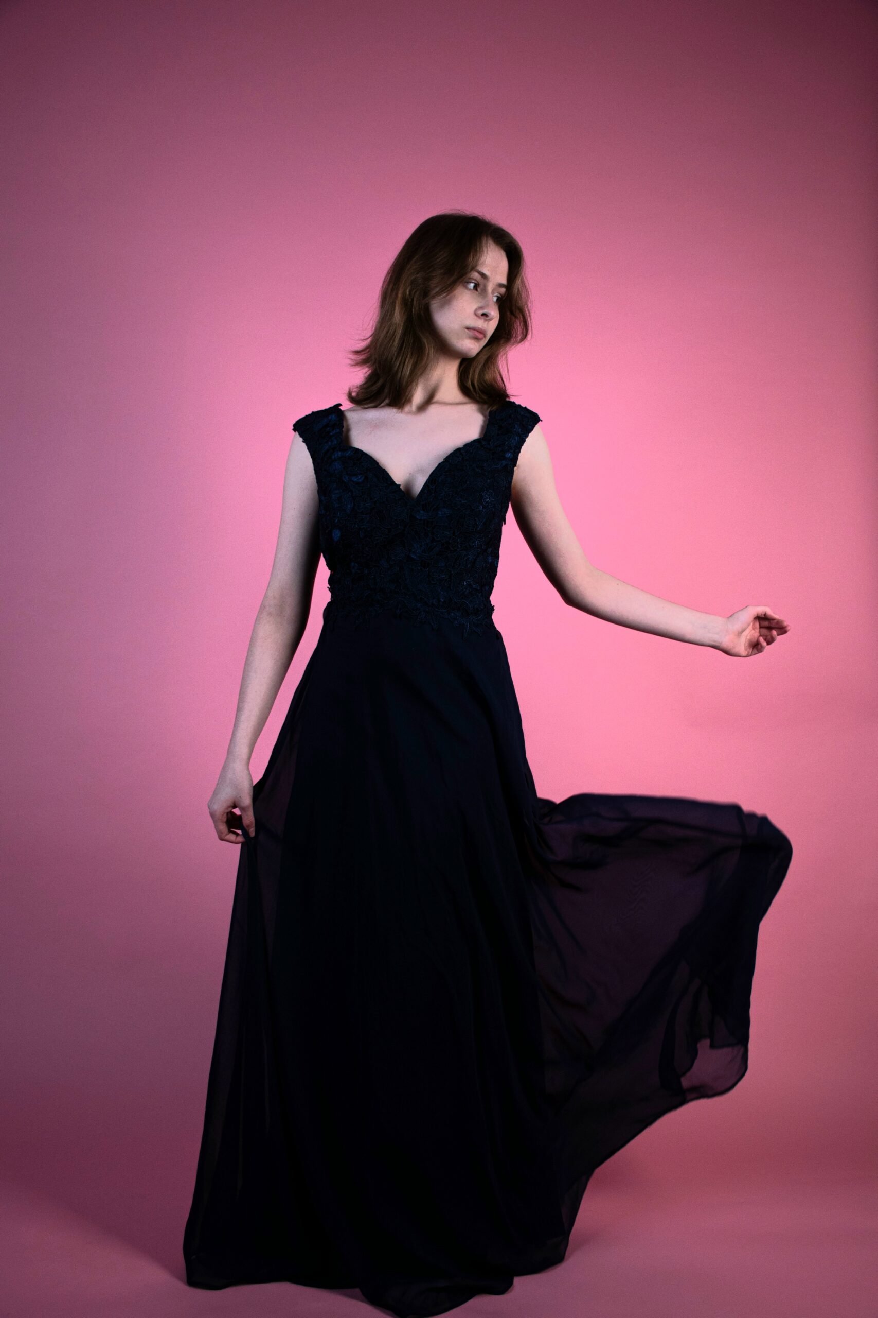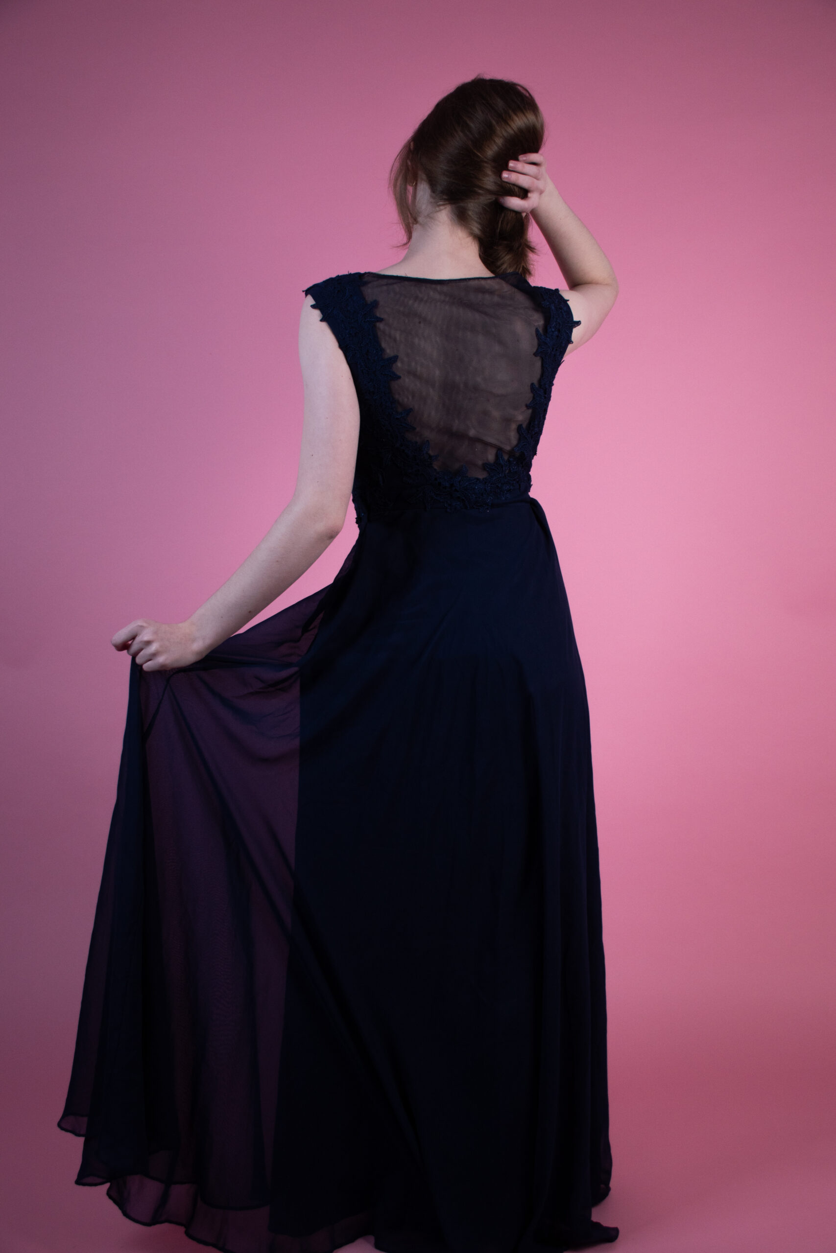 Tmavě modré dlouhé šaty.